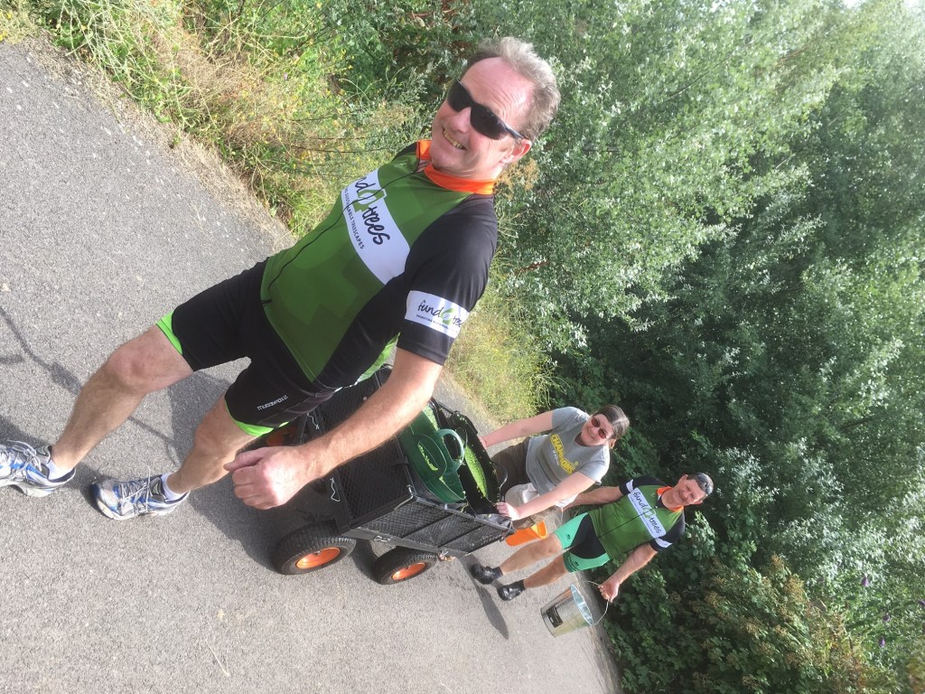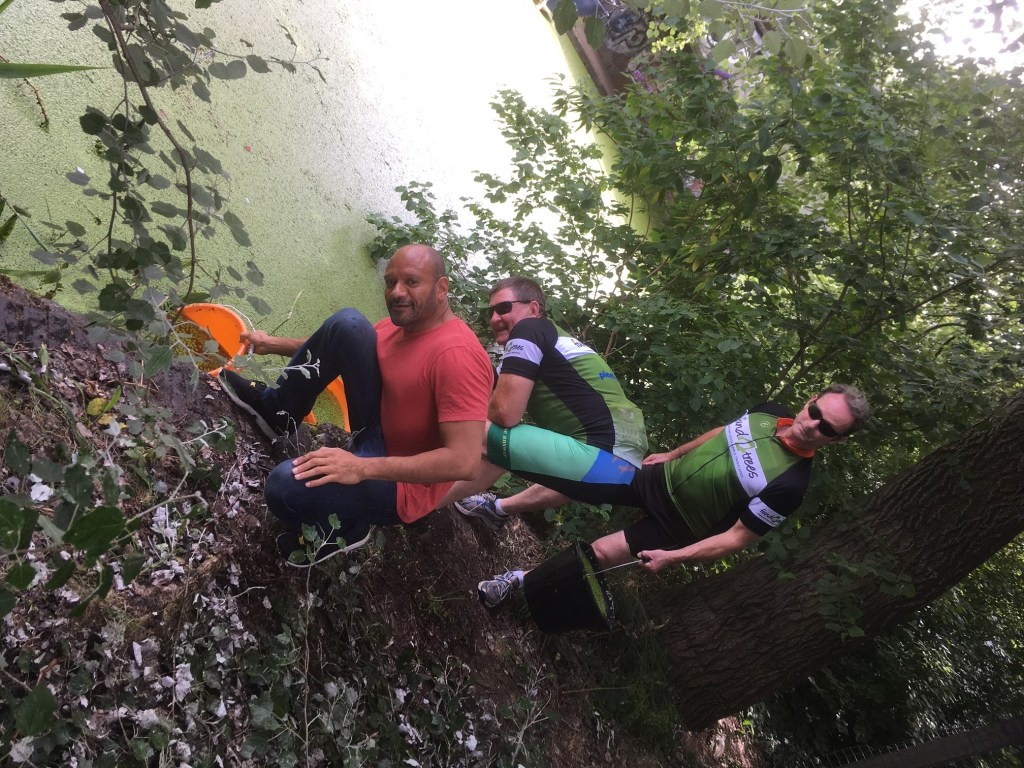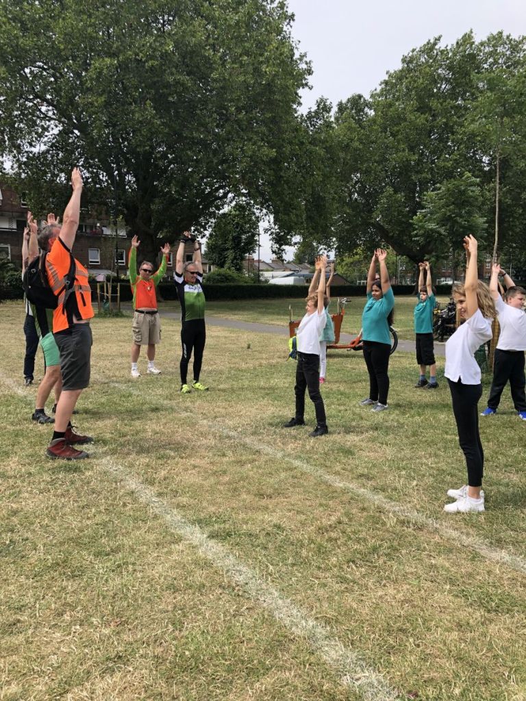 A short coffee-stop at Peckham Rye’s Cafe in the Park and we were back in the saddle again on our way to the community Meath Gardens in Tower Hamlets. Here we were joined by an eager gang of local community minded individuals to irrigate trees using local canal water extracted using buckets and wheeled carts. It was great to see Ben Connor, (GLA Senior Policy and Programmes Officer – Green Infrastructure) help with the watering.