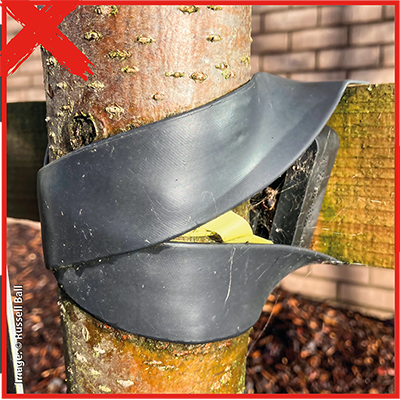 Why? The pressure of a tree-tie can constrict the growth of the trunk, causing damage to the bark and the living/conductive tissue underneath (phloem, cambium & xylem). This restricts the flow of resources that the tree needs to survive (water, nutrients and carbohydrates). Therefore, through a lack of good aftercare or a lack of understanding, these trees will struggle to establish in the landscape, with many dying as a result.